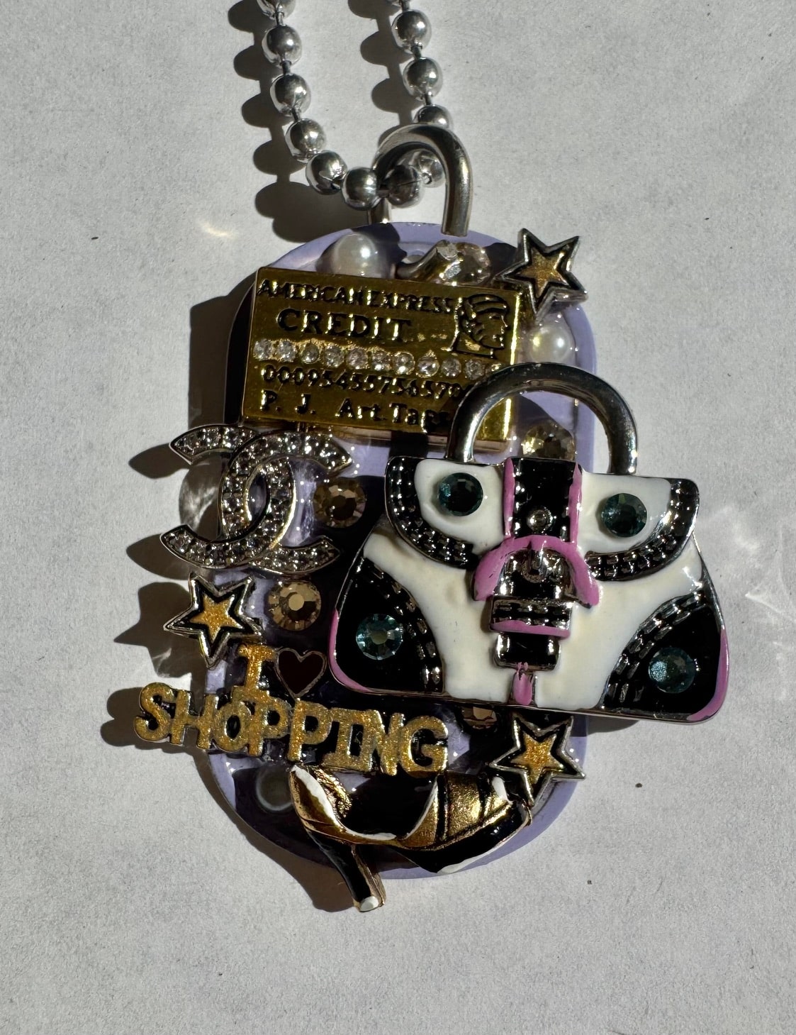 Each one of a kind P.J. Art Tag is uniquely handcrafted and designed using military grade stainless steel dog tags. Every creation is a three-dimensional work of art created using swarovski crystals, nickel free metals and paints, as well as hand casted molded crystal pieces.